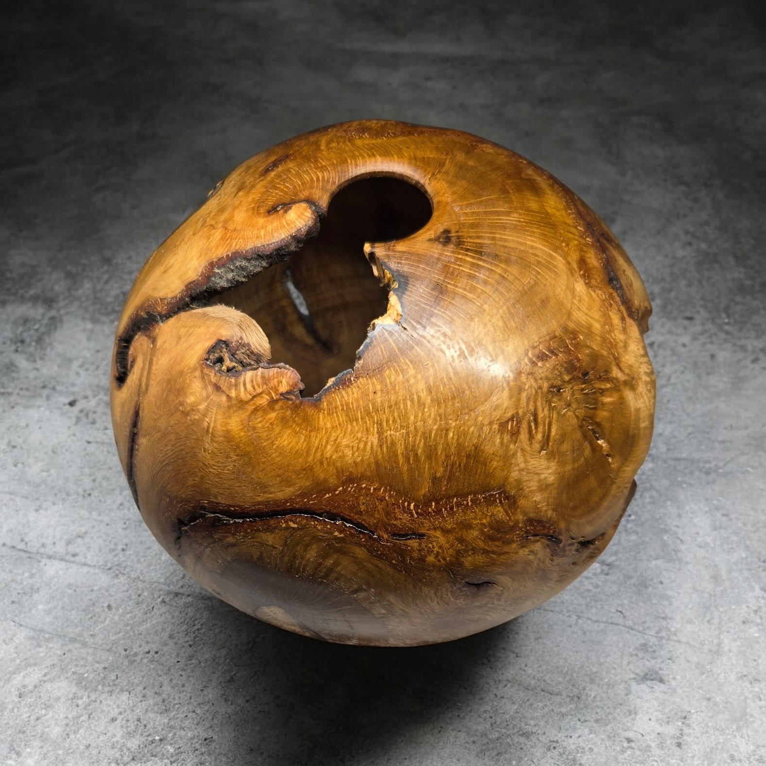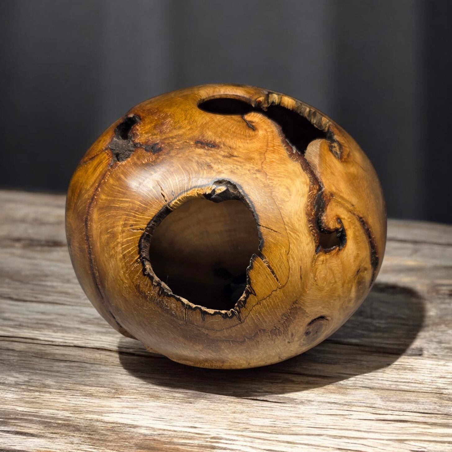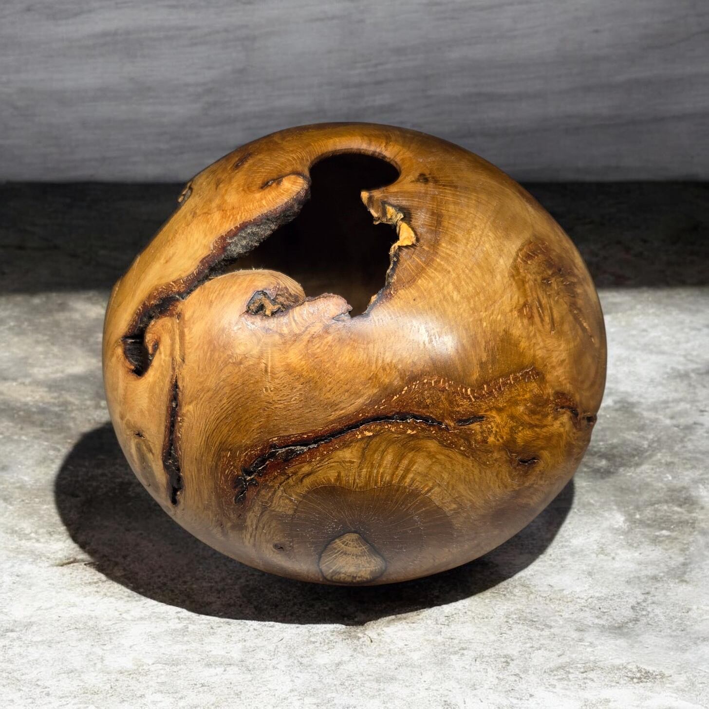 自然の傷跡を活かす: 根っこ特有のうねり、入り皮、そして自然が生んだ大胆な空洞(ボイド)。それらをあえて「景色」として残し、生命の力強さを表現しています。