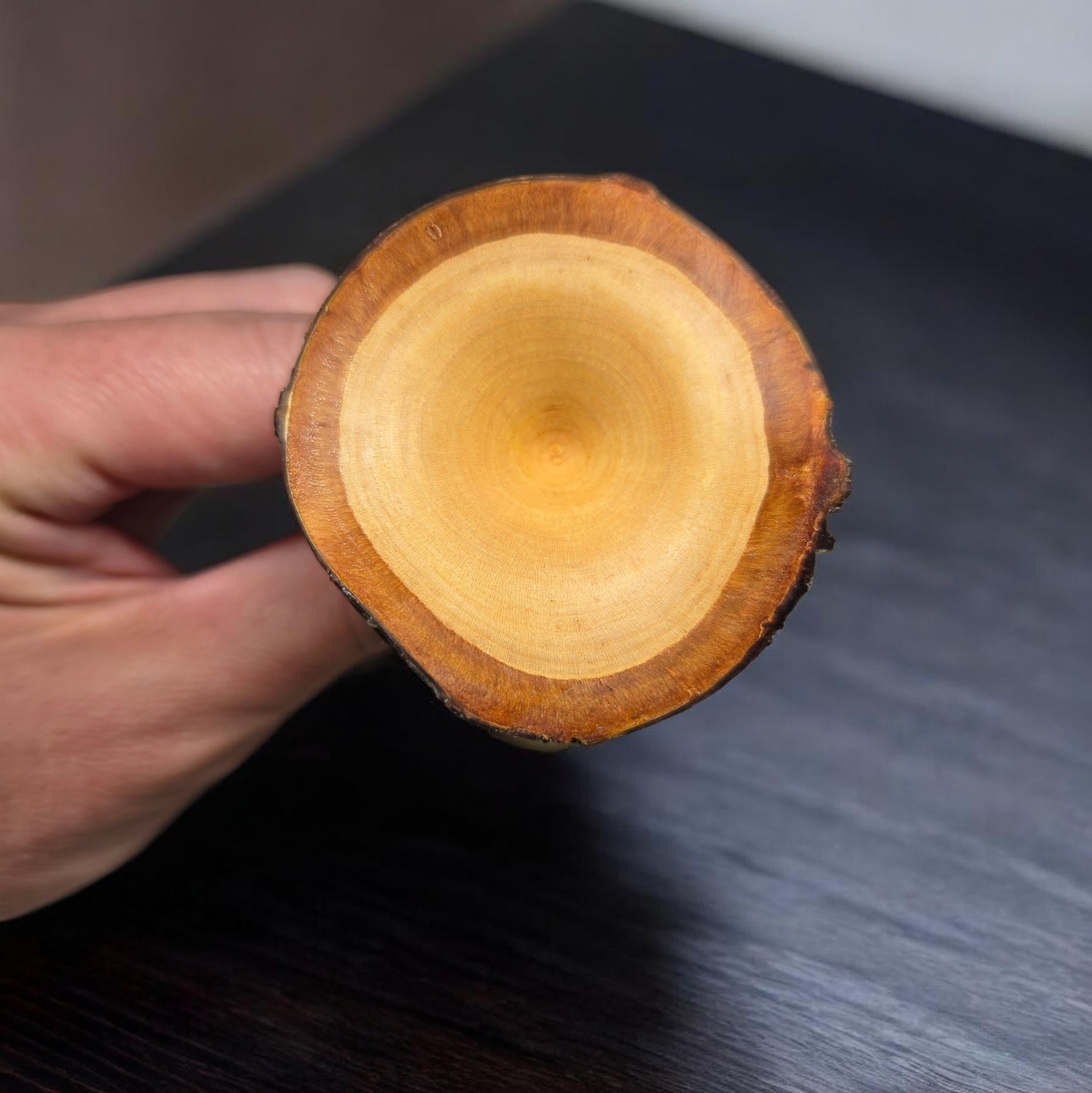この作品は、生命力に溢れた桜の「生枝」から一つひとつ丁寧に削り出し、仕上げられています。最大の特徴は、削り終えた後の「乾燥プロセス」にあります。