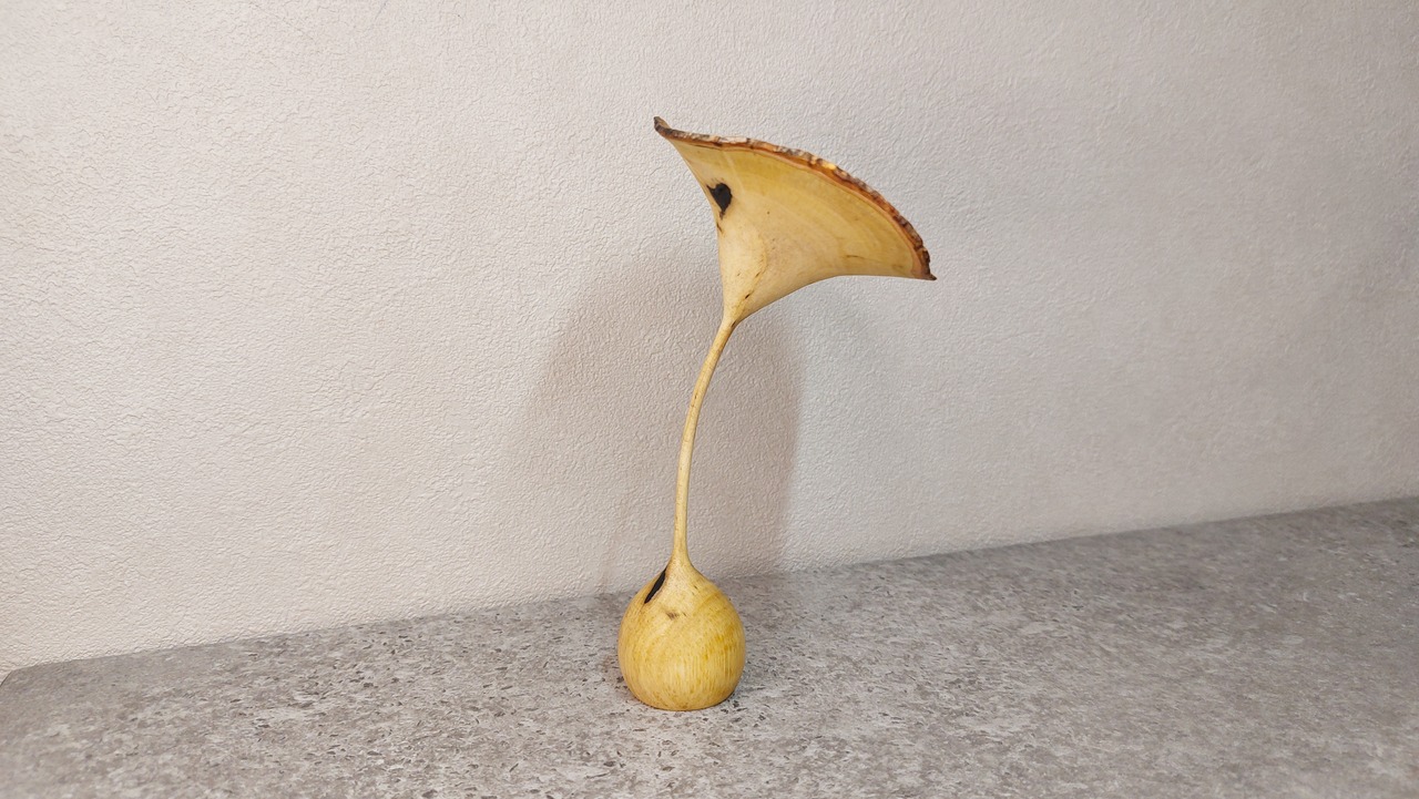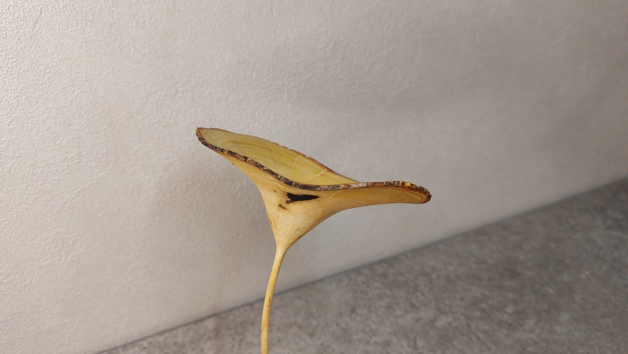 生木から極限まで薄く削ることで大きく変形したオブジェです。このオブジェに限り、ハート柄が出現した非常に希少な作品となりそうです。