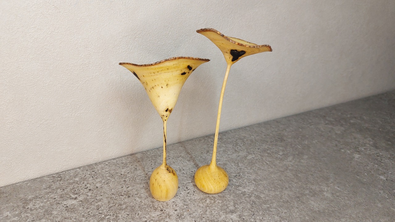 生木から極限まで薄く削ることで大きく変形したオブジェです。非常に繊細な作業を要するため、時より出品しています。
