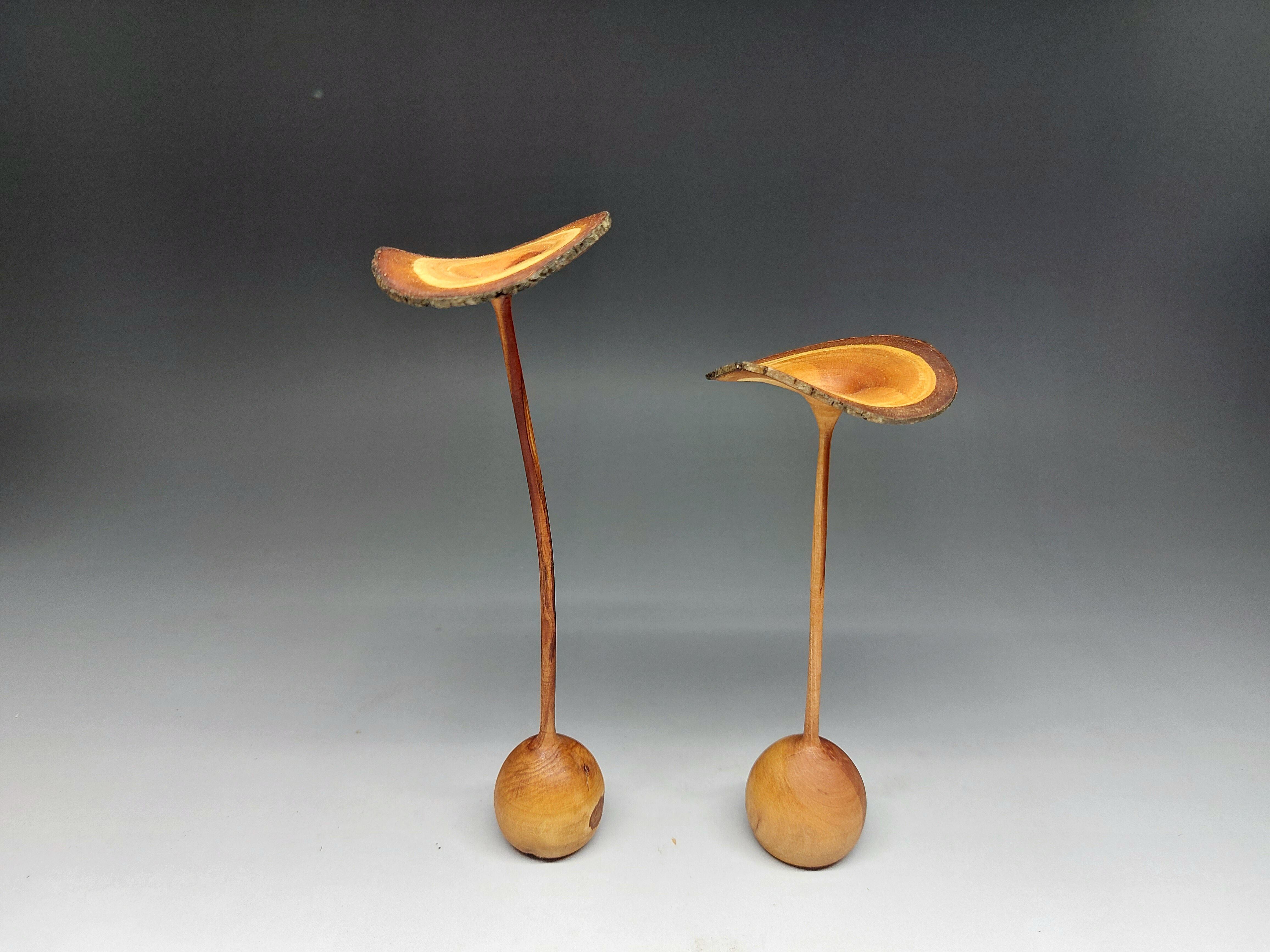 こちらは桜の枝から木工旋盤を使って削り出した一点物になります。